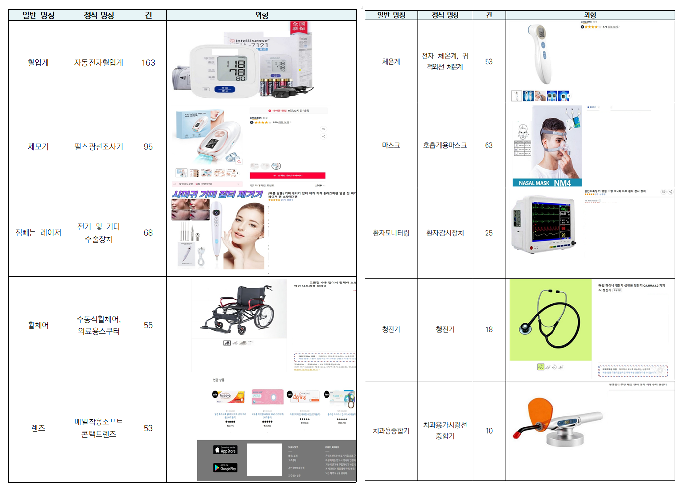 이외에도 ▲환자감시장치(25건), ▲청진기(18건), ▲치과용가시광선중합기(10건) 등 병원 내 전문가 사용 제품도 적발됐다.