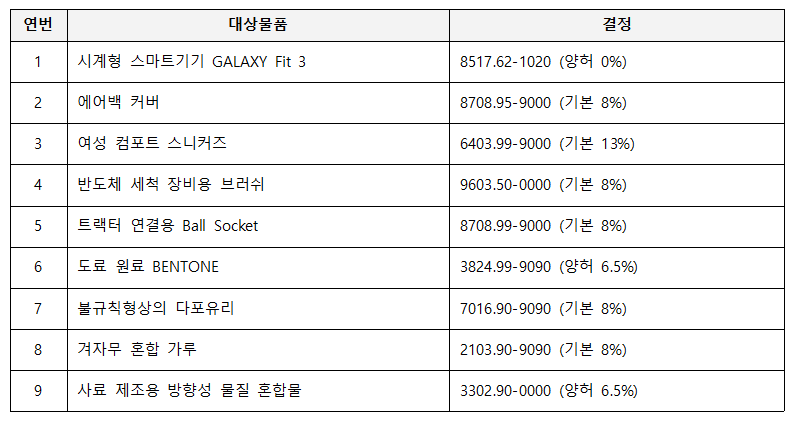 관세청은 지난 7월 3일 열린 2025년 제4회 관세품목분류위원회에서 총 9건의 품목분류를 결정하고, 해당 내용을 반영한 「 수출입물품 등에 대한 품목분류 변경고시 」 개정안을 8월 13일 관보에 게재했다.