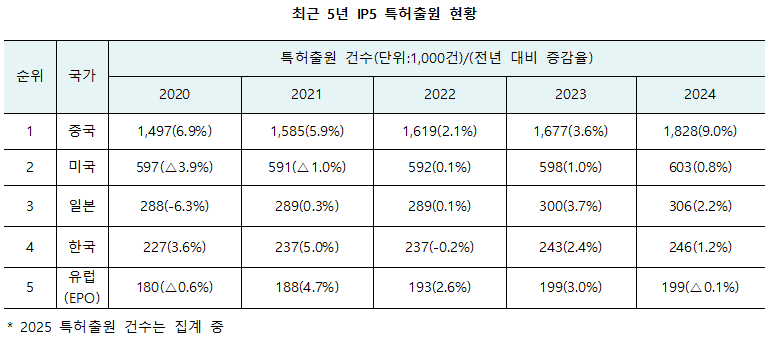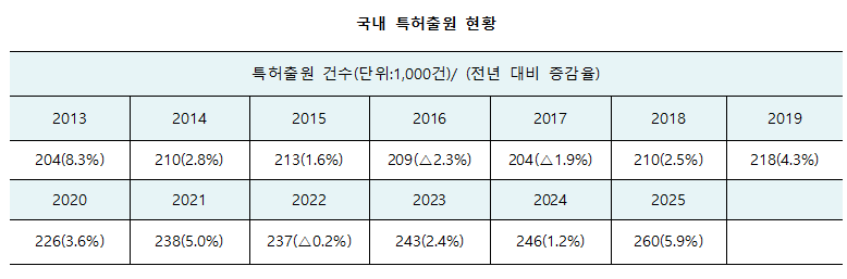 1월 29일 지식재산처에 따르면 2025년 국내 특허출원은 총 26만 797건으로, 전년(24만 6,245건) 대비 5.9% 증가했다. 국내 특허출원이 26만건을 넘어선 것은 2013년 20만건을 처음 돌파한 이후 12년 만이다. 연간 특허출원 26만건 이상을 기록한 국가는 일본(1984년), 미국(1999년), 중국(2008년)에 이어 한국이 네 번째다. 한국은 2024년 기준 중국·미국·일본에 이어 세계 4위의 특허출원 규모를 기록했으며, 2025년에도 같은 순위를 유지할 것으로 전망된다.