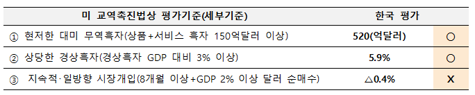 미국은 교역촉진법에 따라 ▲대미 상품·서비스 무역흑자 150억달러 이상 ▲국내총생산(GDP)의 3% 이상 경상수지 흑자 ▲GDP의 2% 이상 및 8개월 이상 미 달러 순매수 등 세 가지 기준을 적용한다. 이 가운데 두 가지 요건을 충족하면 관찰대상국, 세 가지 모두 충족하면 심층분석국으로 지정된다. 한국은 이번 평가에서 대미 무역흑자와 경상수지 흑자 요건을 충족해 관찰대상국으로 분류됐다.