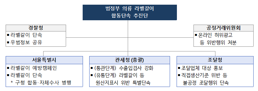 관세청은 공정거래위원회, 조달청, 경찰청, 서울특별시와 함께 2월 9일부터 5월 19일까지 100일간 합동 기획단속을 실시한다고 밝혔다. 라벨갈이는 외국산 의류의 원산지 라벨을 제거하고 국산 라벨을 붙여 유통·판매하는 행위로, 소비자 기만과 국내 의류 산업 피해를 초래하는 대표적인 불공정 행위로 지적돼 왔다.