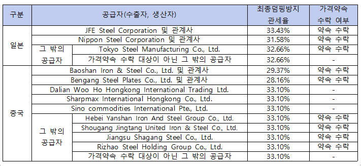 무역위는 2025년 9월부터 부과된 잠정 덤핑방지관세의 실효성을 인정하고 덤핑 수입으로 인한 국내 산업의 실질적 피해에 대처하기 위해 일본산에 최대 33.43%, 중국산에 최대 33.10%의 덤핑방지관세 부과를 재정경제부장관에게 건의하기로 최종 판정했다.