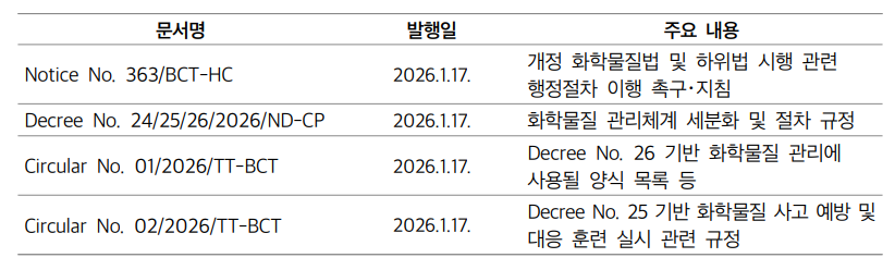 상위법 개정 이후 하위 법령 정비가 지연되면서 화학물질 관련 행정절차가 사실상 정지된 시기가 있었다. 이에 2026년 1월 17일, 베트남 산업무역부(MoIT, The Ministry of Industry and Trade of Vietnam)는 공문을 발행해 개정 화학물질법 시행을 위한 하위 법령 정비 완료를 공식화하고, 관계 기관 및 지방정부에 수출입 허가·신고 절차의 신속·투명·일관된 처리를 촉구했다.