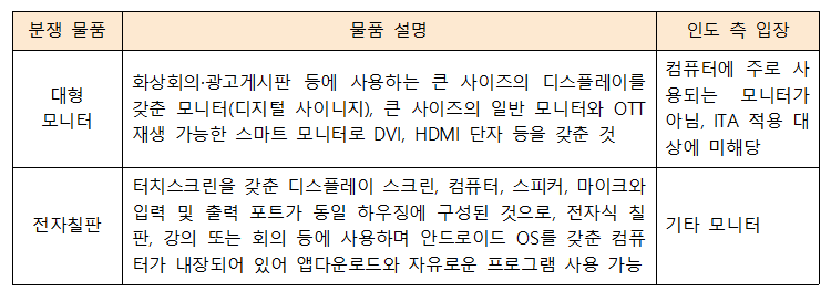 최근 인도 관세당국은 화상회의 및 광고용으로 사용되는 대형 모니터를 컴퓨터에 주로 사용되는 모니터가 아니라고 봐 정보기술협정(ITA) 적용 대상에 해당되지 않는다며 관세를 부과했다.