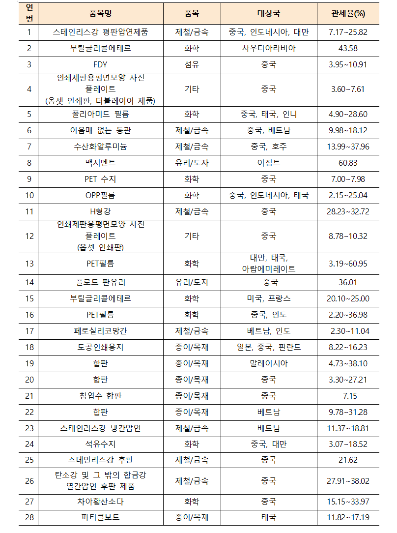 덤핑방지관세 부과 품목(2026년 2월 기준)