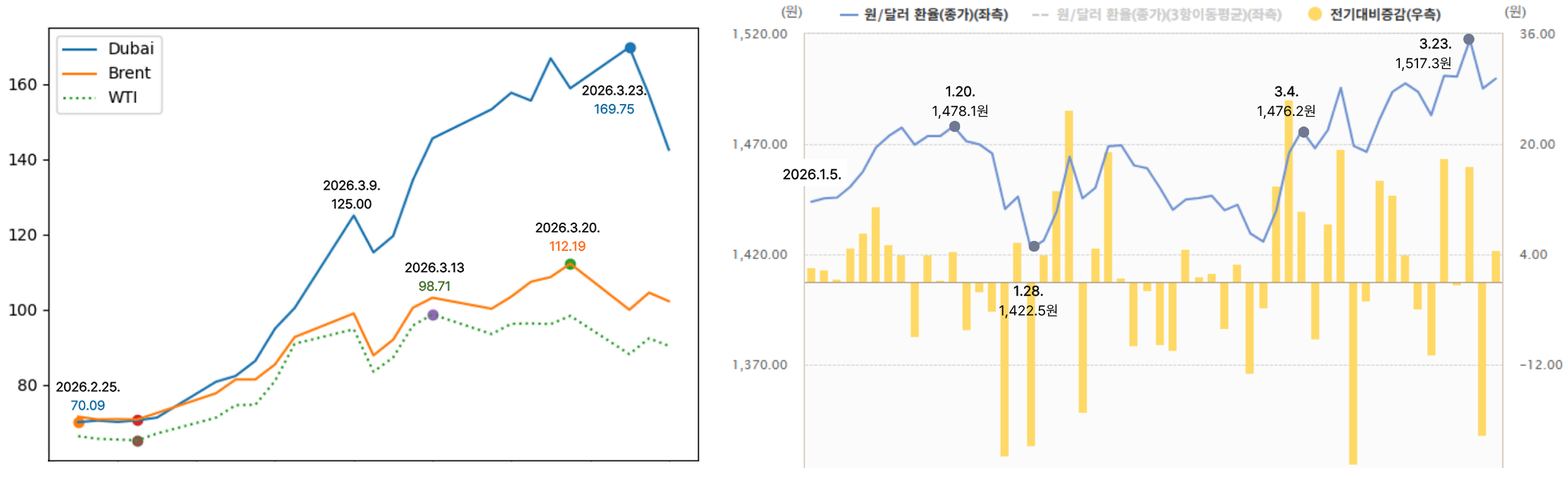 국제 유가 상승 추이(2.25~3.25.) & 국제 유가 원·달러 환율 추이(1.5.~3.25.)