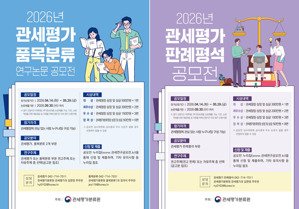 공모전은 ‘관세평가 및 품목분류 연구논문’과 ‘관세평가 판례평석’ 두 분야로 나뉘어 진행된다. 참가 신청은 5월 29일까지이며, 논문 제출은 9월 30일까지다. 최종 수상작은 11월 발표될 예정이다.
