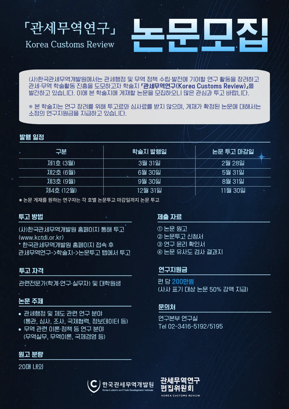 1. 관세무역 분야에 연구를 수행하시는 학자 여러분의 무궁한 발전을 기원합니다. 2. (사)한국관세무역개발원에서는 관세행정 및 무역 정책 수립·발전에 기여할 수 있는 연구활동을 장려하고, 관세·무역 학술활동 진흥을 도모하고자 학술지 「관세무역연구(Korea Customs Review)」를 발간하고 있습니다. 3. 본 학술지 「관세무역연구」 통권 제9호(2026년 3월 31일 발행)에 게재할 학술논문을 다음과 같이 모집하오니 많은 관심과 투고 바랍니다. - 다 음 - - 논문제출기한: 2026년 2월 28일(논문발간 예정일: 2026년 3월 31일) - 논문주제 : 관세행정 및 제도 관련 연구 분야(통관, 심사, 조사, 국제협력, 정보데이터 등)/ 무역 관련 이론·정책 등 연구분야(무역실무, 무역이론, 국제경영 등) - 투고자격 : 관련 전문가(학계·연구·실무자) 및 대학(원)생 4. 본 학술지는 관세무역 분야 연구 장려를 위해 투고료와 심사료를 납부받지 않으며, 게재가 확정된 논문에 대해서는 편 당 200만 원의 연구지원금을 지급하고 있습니다. 5. 논문은 (사)한국관세무역개발원 홈페이지(www.kctdi.or.kr)를 통해 투고바라며, 투고시 투고논문 및 논문신청서, 연구윤리확인서와 저작권동의서, KCI논문유사도검사결과서를 제출해주시길 바랍니다.